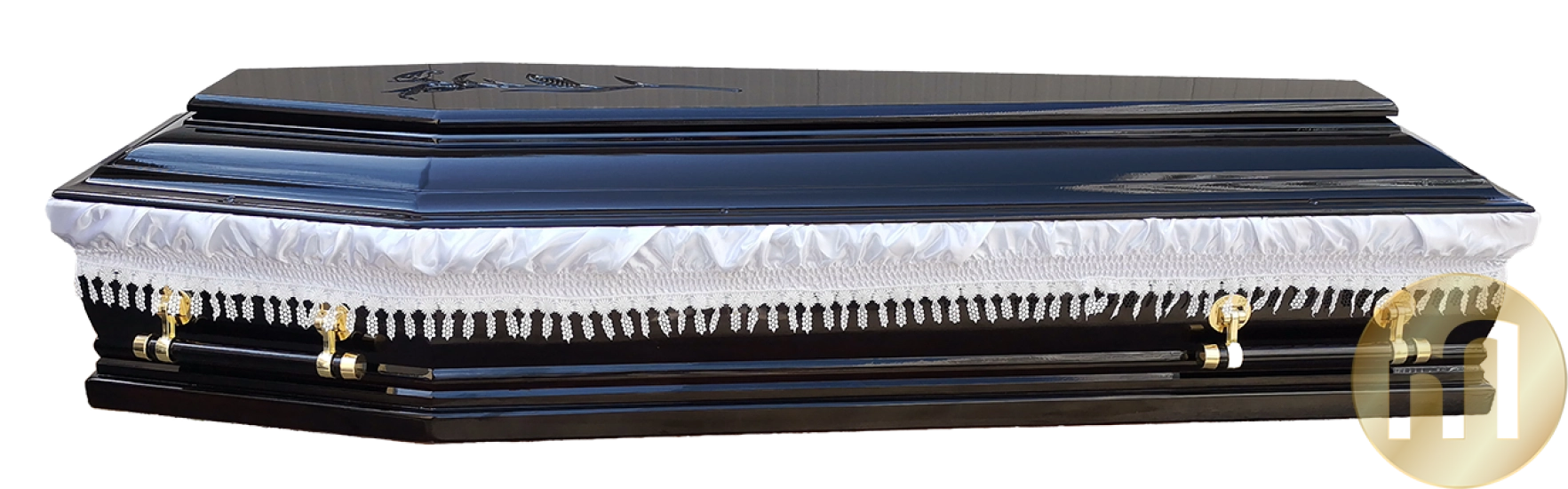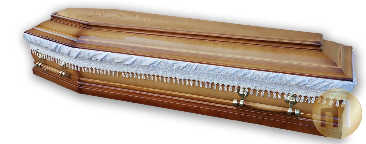 Sicriu SL18B - Lemnul de tei, floarea sculptata pe capac,manerele din lemn premiumcu ornamente dar si calitatea finisajelor fac din acesta un sicriu usor de remarcat.